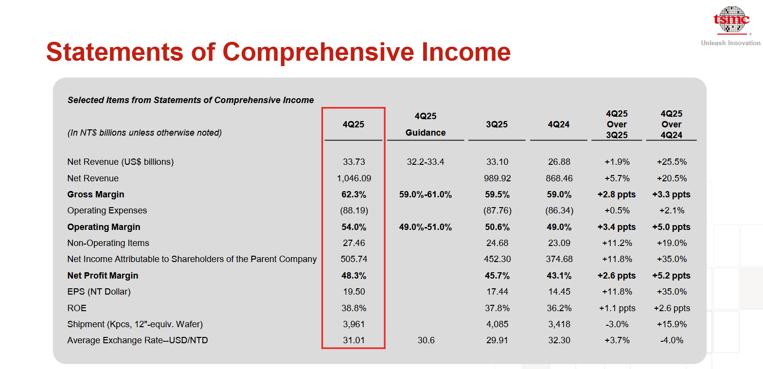 | Selected Items from Statements of Comprehensive Income | | | | | --- | --- | --- | --- | | | 4Q25 | 4Q25 | 3Q25 | | (In NT$ billions unless otherwise noted) | | Guidance | | | Net Revenue (US$ billions) | 33.73 | 32.2-33.4 | 33.10 | | Net Revenue | 1,046.09 | | 989.92 | | Gross Margin | 62.3% | 59.0%-61.0% | 59.5% | | Operating Expenses | (88.19) | | (87.76) | | Operating Margin | 54.0% | 49.0%-51.0% | 50.6% | | Non-Operating Items | 27.46 | | 24.68 | | Net Income Attributable to Shareholders of the Paren ...