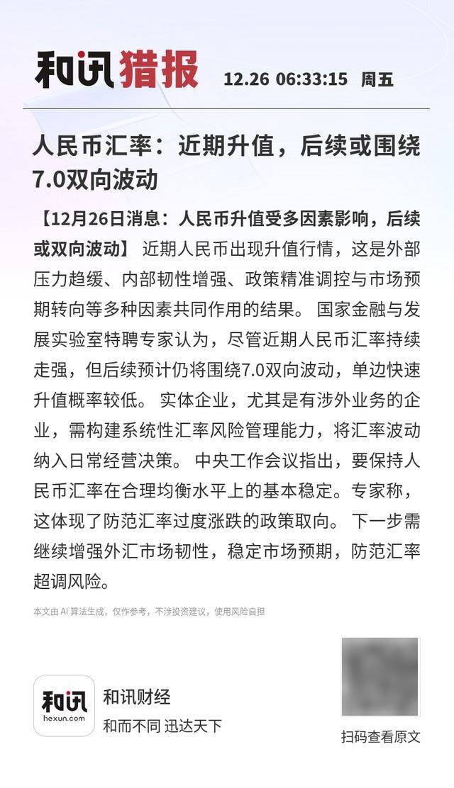 【12月26日消息:人民币升值受多因素影响,后续或双向波动】近期人民币出现升值行情,这是外部压 力趋缓、内部韧性增强、政策精准调控与市场预期转向等多种因素共同作用的结果。国家金融与发展实 验室特聘专家认为,尽管近期人民币汇率持续走强,但后续预计仍将围绕7.0双向波动,单边快速升值 概率较低。实体企业,尤其是有涉外业务的企业,需构建系统性汇率风险管理能力,将汇率波动纳入日 常经营决策。中央工作会议指出,要保持人民币汇率在合理均衡水平上的基本稳定。专家称,这体现了 防范汇率过度涨跌的政策取向。下一步需继续增强外汇市场韧性,稳定市场预期,防范汇率超调风险。 和讯财经 # UF hexun.com 和而不同 迅达天下 扫码查看原文 本文由 AI算法生成,仅作参考,不涉投资建议,使用风险自担 ...