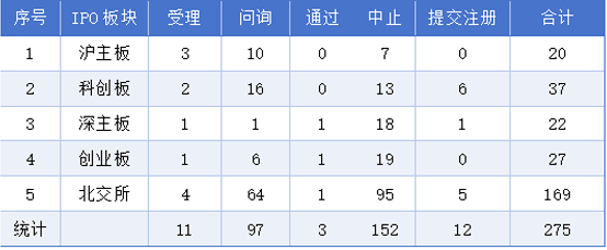 IPO Pipeline Overview - As of October 19, there are 275 companies in the IPO pipeline, with 20 on the Shanghai Main Board, 37 on the Sci-Tech Innovation Board, 22 on the Shenzhen Main Board, 27 on the Growth Enterprise Market, and 169 on the Beijing Stock Exchange [1] IPO Application Status - The statistics for IPO applications show that there were 11 accepted, 97 in inquiry, 3 approved, 152 halted, and 12 submitted for registration across all boards [2] Newly Listed Companies - During the period from October 13 to October 19, two companies were newly listed: - Changjiang Samsung Energy Technology Co., Ltd. closed at 18.87 yuan per share, with a rise of 254.03% and a trading volume of 524 million yuan [3] - Daosheng Tianhe Materials Technology (Shanghai) Co., Ltd. closed at 29.68 yuan per share, with a rise of 396.32% and a trading volume of 2.301 billion yuan [4] New Counseling Registrations - Seven new companies registered for counseling from October 13 to October 19, including: - Zhongke Fuhai Technology Co., Ltd. focuses on advanced low-temperature equipment and solutions for energy applications [5] - Wuhu Youpai Nursing Products Technology Co., Ltd. specializes in disposable hygiene products [6] - Qingdao Wuxiao Group Co., Ltd. engages in the research and production of steel structures [7] - Shanghai Shanyuan Electronic Technology Co., Ltd. develops smart mining communication and safety products [7] - Xuyu Optoelectronics (Shenzhen) Co., Ltd. focuses on semiconductor lighting devices [7] - Xinjiang Xinxin Mining Co., Ltd. is involved in the mining and refining of non-ferrous metals [7] - Jiangsu Tianbing Aerospace Technology Co., Ltd. specializes in liquid rocket engines [7] CSRC Review Status - Three companies successfully passed the review process from October 13 to October 19: - Xiamen Youxun Chip Co., Ltd. specializes in optical communication chips [8] - Beijing Angrui Microelectronics Technology Co., Ltd. focuses on RF and analog integrated circuit design [8] - Shenzhen Tiansu Measurement and Testing Co., Ltd. provides independent third-party measurement services [8] CSRC Registration Approval - Two companies received registration approval during the same period: - Bai'ao Saitou (Beijing) Pharmaceutical Technology Co., Ltd. is a preclinical CRO and biotechnology firm [9] - Southern Power Grid Digital Grid Research Institute Co., Ltd. offers digital solutions for the power energy sector [9] Termination of IPO Reviews - No companies withdrew their IPO applications from October 13 to October 19 [10]