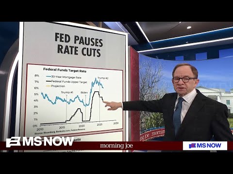 FOR THE FIRST TIME SINCE JULY, THE TWO FED GOVERNORS APPOINTED BY PRESIDENT TRUMP DISAGREED WITH THE MOVE MIRRORING TRUMP'S CALL TO LOWER RATES IN THEIR DECENT. LET'S BRING IN FORMER TREASURY OFFICIAL AND MORNING JOE ECONOMIC ANALYST STEVE RATNER WHO HAS CHARTS ON YESTERDAY'S FED DECISION. FIRST UP, EXPLAIN THE PAUSE, THANK YOU VERY MUCH FOR JOINING US, STEVE.YEAH, AS YOU SAID MECA, THE FED HAS BEEN REDUCING RATES PRETTY STUDILY SINCE JULY WHEN THEY PEAKED AT ABOUT ALMOST 5 .5 % AND THEY'VE GONE DOWN, DOWN, ...
