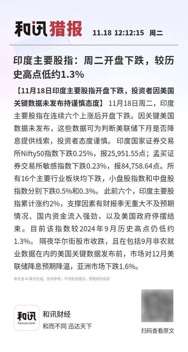【11月18日印度主要股指开盘下跌,投资者因美国关键数据未发布持谨慎态度】11月18日周二,印度主 要股指在连续六个上涨后开盘下跌。因关键美国数据未发布,这些数据可为判断美联储下月是否降息提 供线索,投资者态度谨慎。 印度国家证券交易所Nifty50指数下跌0.25%,报25,951.55点;孟买证券交易 所敏感指数下跌0.23%,报84,758.64点。所有16个主要行业板块均下跌,小盘股指数和中盘股指数分别 下跌0.5%和0.3%。 此前六个,印度主要股指累计涨约2%,支撑因素有财报季无重大不及预期情况、国 内资金流入强劲,以及美国政府停摆结束。目前该指数较2024年9月历史高点仍低约1.3%。 隔夜华尔街 股市收跌,且在包括9月非农就业数据在内的美国关键数据发布前,市场对12月美联储降息预期降温, 亚洲市场下跌1.6%。 本文由 AI 算法生成,仅作参考,不涉投资建议,使用风险自担 扫码查看原文 业数据在内的美国关键数据发布前,市场对12月美 联储降息预期降温,亚洲市场下跌1.6%。 本文由 Al 算法生成,仅作参考,不涉投资建议,使用风险自担 和讯财经 和而不同 迅达天下 ...