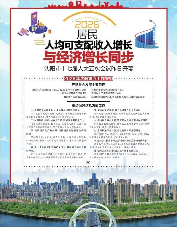 2026年沈阳重点工作安排 经济社会发展主要目标 地区生产总值增长4.5%左右,在工作中争取更好结果 一般公共预算收入增长1% 固定资产投资增长3% 社会消费品零售总额增长4.5% 规模以上工业增加值增长4% 城镇和农村居民人均可支配收入增长与经济增长同步 重点做好这几方面工作 一、增强扩大内需主动力,全力保持经济稳步增长 着力提升创新策源、技术攻关、成果转化能力,促进科技创新与产业创新深度融合,努力激活创新体系 整体效能。 三、建设现代化产业体系,巩固提升先进制造业优势地位 坚持智能化、绿色化、融合化发展,统筹新动能培育和旧动能焕新,加快打造国家先进制造中心、东北 现代服务业中心。 四、进一步全面深化改革扩大开放,持续激发振兴发展动力活力 充分发挥改革的突破和先导作用,奔着现实问题去,盯着突出问题改,坚决破除制约高质量发展的体制 机制弊端。 五、坚持内涵式发展,着力建设现代化人民城市 深入践行人民城市理念,编制实施全域空间发展战略规划,加力提升城市功能品质。 六、促进城乡融合发展,不断开创乡村全面振兴新局面 加快农业农村现代化,推动农业基础更加稳固、农村地区更加繁荣、农民生活更加红火。 深入实施扩大内需战略 ...
