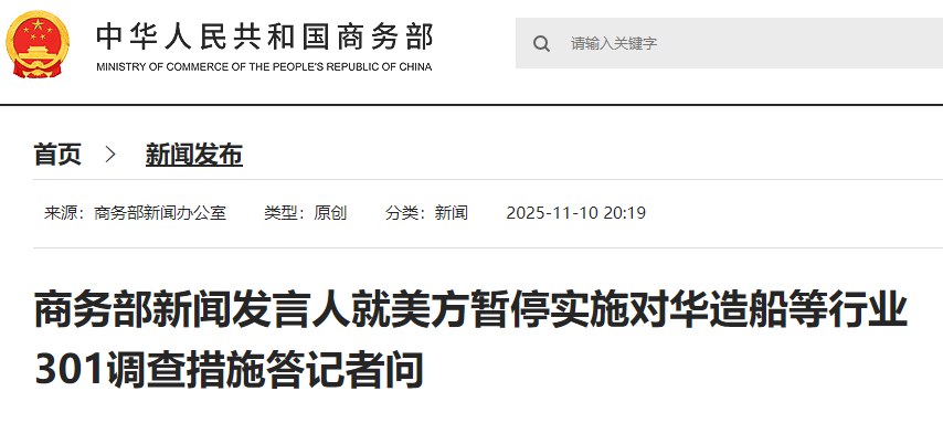 Core Viewpoint - The U.S. Trade Representative announced a suspension of the Section 301 investigation measures against China's shipbuilding industry, effective November 10, which includes halting port fees and additional tariffs on Chinese ship-related equipment. This move is seen as a step towards mutual cooperation between the U.S. and China in trade discussions [1]. Group 1 - The U.S. will suspend the implementation of Section 301 investigation measures against China's shipbuilding industry for one year [1]. - The suspension includes halting port fees on relevant Chinese vessels and additional tariffs on Chinese shore cranes and related equipment [1]. - This action is viewed as a significant step in fulfilling the consensus reached during the U.S.-China economic consultations in Kuala Lumpur [1]. Group 2 - China has also decided to suspend its corresponding countermeasures in response to the U.S. announcement [1]. - China expresses willingness to engage in communication and negotiation with the U.S. based on mutual respect and equal consultation principles [1]. - The aim is to maintain a fair competitive environment in the international shipping and shipbuilding markets, contributing to stability in U.S.-China economic cooperation and the global economy [1].