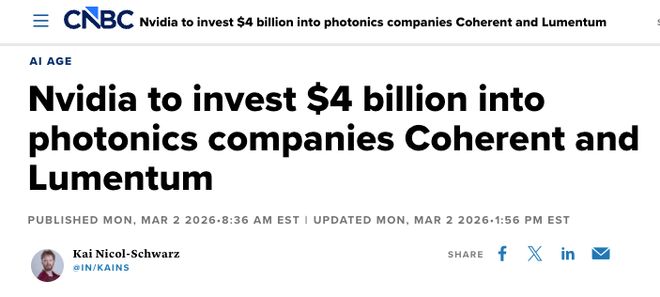 来源:环球网 Lumentum是一家总部位于美国的科技企业,长期致力于光学和光子技术的研发,其成果为人工智能、 云计算以及下一代通信背后的网络和基础设施提供有力支撑。 同样总部位于美国的Coherent,专注于光子技术领域。该技术利用光子制造能够实现高性能光学应用的 组件和系统。 英伟达创始人兼首席执行官黄仁勋在声明中表示:"英伟达正与Lumentum携手,共同推进世界上最先进 的硅光子技术,以此构建下一代千兆瓦级人工智能工厂。"据悉,英伟达与Lumentum达成的协议为多年 战略协议,其中包含英伟达数十亿美元的采购承诺,以及未来对先进激光组件产能的使用权。 此外,黄仁勋还提到,英伟达将与Coherent公司展开合作,共同开发用于人工智能基础设施的下一代硅 光子技术。此次与Coherent公司的合作同样涵盖数十亿美元的采购承诺,以及未来获取先进激光和光网 络产品的权限与容量。(青山) 英伟达将分别向Lumentum和Coherent各投资20亿美元。据悉,这两家被投资公司均专注于光学技术的 开发。光学技术即涉及产生或传输光的系统,可应用于传感和数据传输等多种功能。 【环球网科技综合报道】3月3日消息,据CNB ...