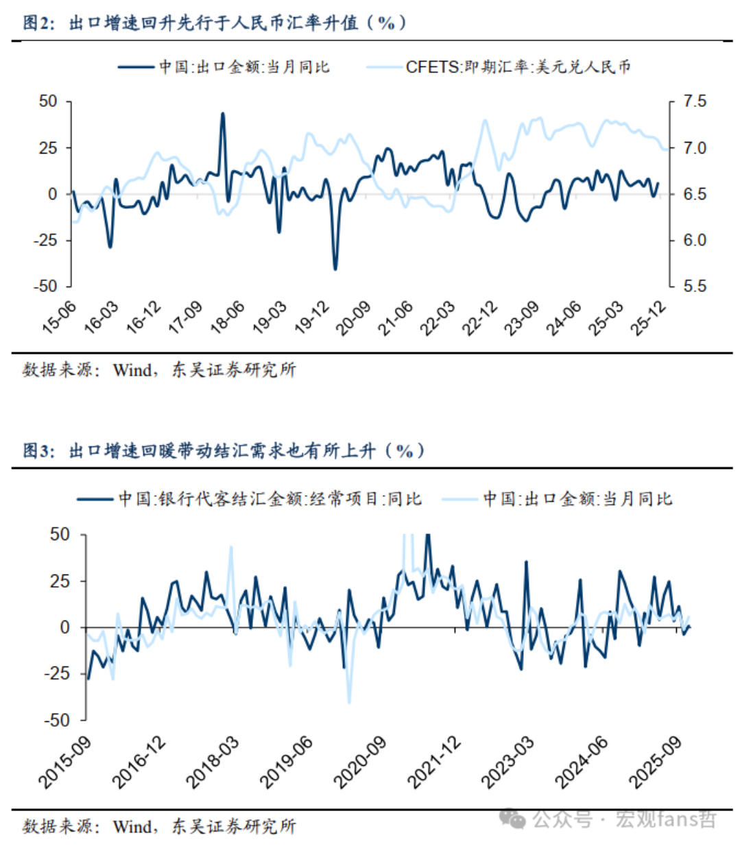 在出口产品结构不断优化升级以及部分高端产品有绝对比较优势的背景下,价格对于出口的影响逐步减弱。 2025年末人民币对美元加速升值,市场力量和政策调节共同推动在岸和离岸即期汇价先后破7。展望来看,2025年不仅是过去3年贬值周期的结束,还可能 开启新一轮升值周期,我们预计2026年在美元指数保持结构性弱势的情况下,人民币汇率有望延续升值态势,到2026年底人民币对美元或升向6.7~6.8。 在人民币升值预期下,市场出现了部分对于人民币升值会不会影响出口的担忧。从理论上讲,人民币升值会使得出口货物价格升高,进而使得出口产品竞 争优势减弱,但从2018年以来,我国出口对汇率变化的敏感度明显下滑,在出口产品结构不断优化升级以及部分高端产品有绝对比较优势的背景下,价格 对于我国出口的影响逐步减弱,且随着人民币国际化不断推进,国际贸易结算中人民币结算比重也逐步上升,未来汇率波动对我国出口的扰动将进一步减 弱。 汇率并非出口趋势性变化的主要因素 自2015年"8·11汇改"以来,人民币汇率弹性显著提升,双向波动特征更加明显,因此我们主要考察"8·11"汇改以来汇率变动对于出口的影响。 "8·11汇改"以来,人民币对美元即期 ...