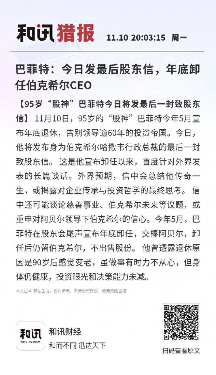 和讯财经 和而不同 迅达天下 扫码查看原文 因是90岁后感觉变老,虽做事有时力不从心,但身 体仍健康, 投资眼光和决策能力未减。 本文由 Al 算法生成。仅作参考,不涉投资建议,使用风险自担 【95岁"股神"巴菲特今日将发最后一封致股东信】11月10日,95岁的"股神"巴菲特今年5月宣布年底退休, 告别领导逾60年的投资帝国。今日,他将发布身为伯克希尔哈撒韦行政总裁的最后一封致股东信。 这是他 宣布卸任以来,首度针对外界发表的长篇谈话。外界预期,信中会总结他传奇一生,或揭露对企业传承与 投资哲学的最终思考。 信中还可能谈论慈善事业、伯克希尔未来等议题,或重申对阿贝尔领导下伯克希尔 的信心。今年5月,巴菲特在股东会尾声宣布年底卸任,交棒阿贝尔,卸任后仍留伯克希尔,不出售股 份。 他曾透露退休原因是90岁后感觉变老,虽做事有时力不从心,但身体仍健康,投资眼光和决策能力未 减。 本文由 AI 算法生成,仅作参考,不涉投资建议,使用风险自担 ...
