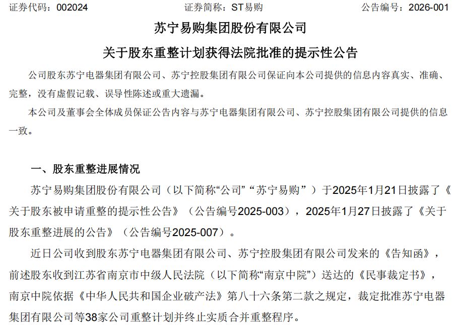 每经记者|陈婷 每经编辑|余婷婷 苏宁系的"自救"还在继续。 1月5日,ST易购(原简称苏宁易购,SZ:002024,股价1.71元,总市值158.43亿元)发布《关于股东重整计划获得法院批准的提示性公告》。公告提及,近 日公司收到股东苏宁电器集团有限公司、苏宁控股集团有限公司发来的《告知函》,前述股东收到江苏省南京市中级人民法院(以下简称南京中院)送达的 《民事裁定书》,南京中院依据《中华人民共和国企业破产法》第八十六条第二款之规定,裁定批准苏宁电器集团有限公司等38家公司重整计划并终止实质 合并重整程序。 苏宁易购发布的上述公告提及,根据南京中院裁定的《重整计划》,公司股东张近东(苏宁创始人)拟将其持有的公司未质押股票的收益权和已质押股票的 超额收益权,注入重整服务信托。 图片来源:苏宁易购公 告 有市场观点据此认为,这意味着张近东为苏宁搏得一线生机押上了全部身家。 对此,香颂资本董事沈萌接受《每日经济新闻》记者采访时表示,押上全部身家的说法不准确,张近东是将在苏宁的股份全部作为债务重组的担保,"但他 的身家不一定只有苏宁的股份"。 张近东"净身"还债?重整计划执行期限为36个月 2025年1月26日,南 ...