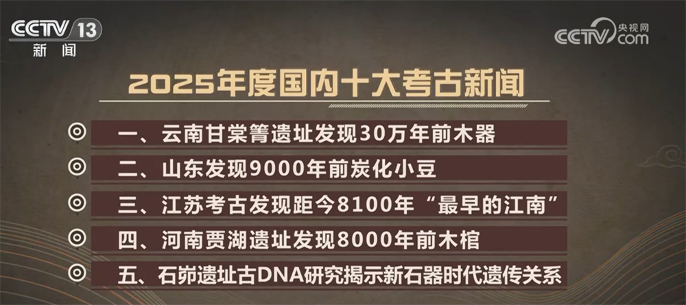十、江西海昏侯墓考古首现秦汉全本《诗经》 央视网消息:中央广播电视总台12月24日发布2025年度国内国际十大考古新闻。 三、江苏考古发现距今8100年"最早的江南" 四、河南贾湖遗址发现8000年前木棺 五、石峁遗址古DNA研究揭示新石器时代遗传关系 2025年度国内十大考古新闻是: 一、云南甘棠箐遗址发现30万年前木器 二、山东发现9000年前炭化小豆 六、浙江绍兴首次发现越国高等级祭祀遗址 七、武王墩考古重大发现再现楚国礼乐文明 八、秦始皇祖母陵墓发现已灭绝的长臂猿新物种 九、青海尕日塘发现秦代刻石 2025年度国际十大考古新闻是: 一、坦桑尼亚发现150万年前骨制工具 二、古DNA分析揭示绵羊与人类1.2万年共生史 三、中国首次以古DNA证实史前存在母系社会 四、哈萨克斯坦发现青铜时代大型聚落遗址 五、秘鲁发现3500年前城市遗址 六、埃及发现3500年前法老墓葬 七、墨西哥发现玛雅最古老、规模最大的纪念性建筑 八、意大利庞贝古城发现罕见巨型壁画 九、伊拉克借助人工智能破译失传的巴比伦颂诗 十、玻利维亚发现蒂瓦纳库文明核心建筑 中央广播电视总台发布2025年国内国际十大体育新闻 1.全民全运大湾区 同 ...
