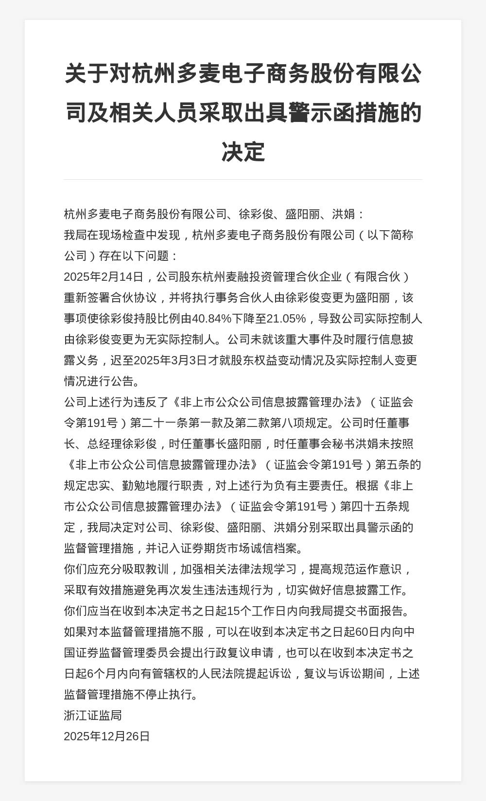 对此,浙江证监局决定对杭州多麦电子商务股份有限公司、徐彩俊、盛阳丽、洪娟分别采取出具警示函的监督管理措施,并记入证券期货市场 诚信档案。 蓝鲸新闻1月5日讯,近日,浙江证监局发布行政监管措施决定书,剑指杭州多麦电子商务股份有限公司及其相关责任人徐彩俊、盛阳丽、洪 娟。 决定书显示,杭州多麦电子商务股份有限公司存在以下问题:2025年2月14日,公司股东杭州麦融投资管理合伙企业(有限合伙)重新签署合 伙协议,并将执行事务合伙人由徐彩俊变更为盛阳丽,该事项使徐彩俊持股比例由40.84%下降至21.05%,导致公司实际控制人由徐彩俊变更 为无实际控制人。公司未就该重大事件及时履行信息披露义务,迟至2025年3月3日才就股东权益变动情况及实际控制人变更情况进行公告。 上述行为违反了《非上市公众公司信息披露管理办法》的规定。公司时任董事长、总经理徐彩俊,时任董事长盛阳丽,时任董事会秘书洪娟未 按照规定忠实、勤勉地履行职责,对上述行为负有主要责任。 采取有效措施避免再次发生违法违规行为,切实做好信息披露工作。 你们应当在收到本决定书之日起15个工作日内向我局提交书面报告。 如果对本监督管理措施不服,可以在收到本决定书之日 ...