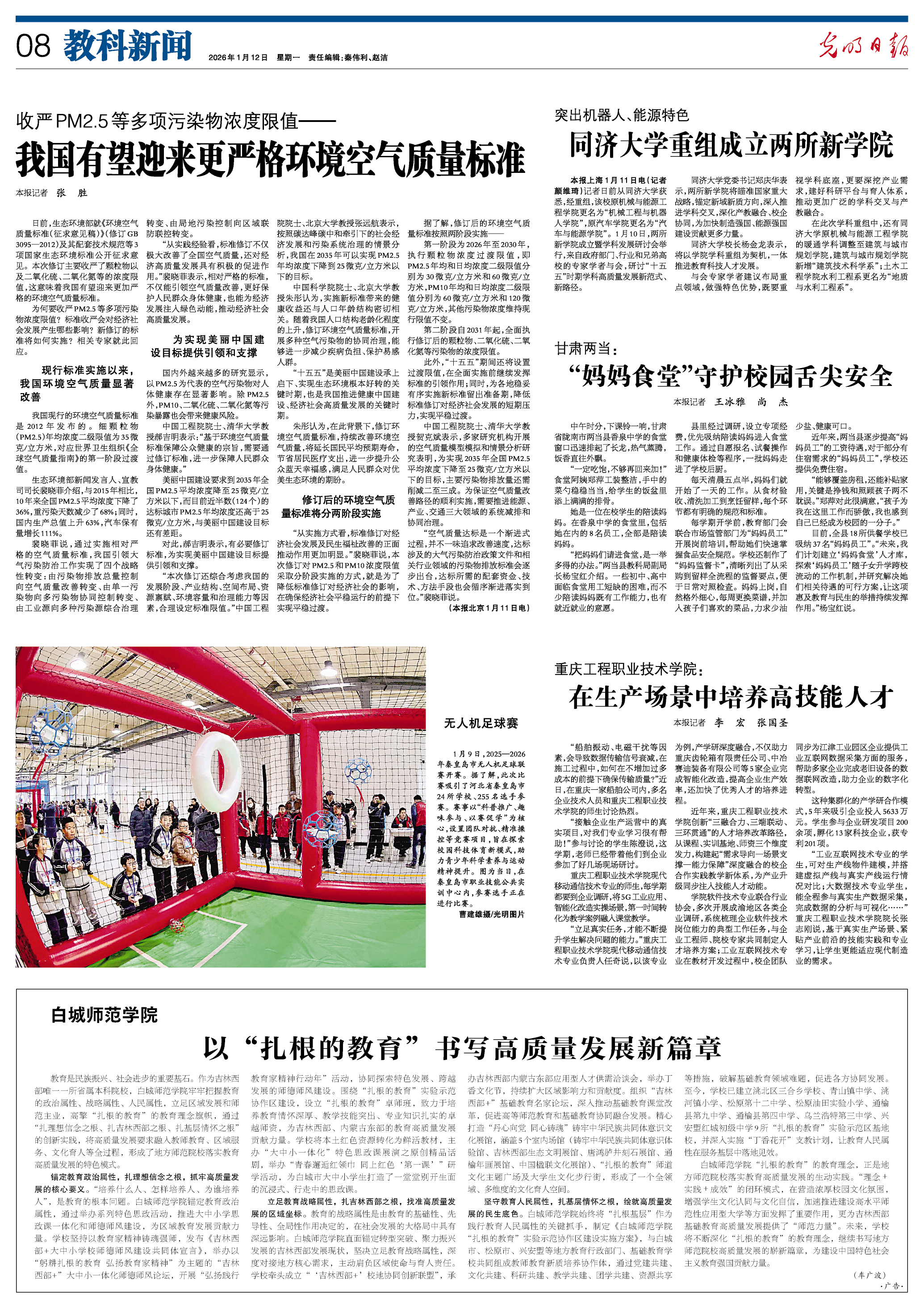 原标题:甘肃两当:"妈妈食堂"守护校园舌尖安全 2026年1月12日 星期一 责任编辑:秦伟利、赵洁 收严 PM2.5 等多项污染物浓度限值- 我国有望迎来更严格环境空气质量 本报记者 张 胖 质量标准(征求意见稿)》(修订 GB 3095—2012)及其配套技术规范等3 项国家生态环境标准公开征求意 见。本次修订主要收严了颗粒物以 及二氧化硫、二氧化氮等的浓度限 值,这意味着我国有望迎来更加严 格的环境空气质量标准。 为何要收严 PM2.5 等多项污染 物浓度限值?标准收严会对经济社 会发展产生哪些影响?新修订的标 准将如何实施?相关专家就此回 M. 现行标准实施以来, 我国环境空气质量显著 改善 我国现行的环境空气质量标准 是 2012 年 发布 的。细 颗 粒 物 (PM2.5)年均浓度二级限值为35 微 克/立方米,对应世界卫生组织《全 球空气质量指南》的第一阶段过渡 值。 生态环境部新闻发言人、宣教 司司长裴晓菲介绍,与2015年相比, 10年来全国PM2.5平均浓度下降了 36%,重污染天数减少了68%;同时, 国内生产总值上升63%,汽车保有 量增长111%。 裴晓菲说,通过实施相对严 格的空气 ...