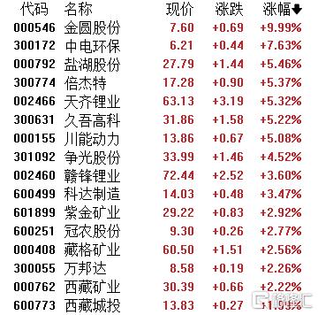 A股市场上,盐湖提锂板块涨幅居前。截至发稿,金圆股份涨停,中电环保、盐湖股份、倍杰特、天齐 锂业、赣锋锂业、亿纬锂能等纷纷跟涨。 | 代码 | 名称 | 现价 | 涨跌 | 涨幅� | | --- | --- | --- | --- | --- | | 000546 | 金圆股份 | 7.60 | +0.69 | +9.99% | | 300172 | 中电环保 | 6.21 | +0.44 | +7.63% | | 000792 | 盐湖股份 | 27.79 | +1.44 | +5.46% | | 300774 | 倍杰特 | 17.28 | +0.90 | +5.37% | | 002466 | 大齐锂业 | 63.13 | +3.19 | +5.32% | | 300631 | 久吾高科 | 31.86 | +1.58 | +5.22% | | 000155 | 川能动力 | 13.86 | +0.67 | +5.08% | | 301092 | 争光股份 | 66'EE | +1.46 | +4.52% | | 002460 | 赣锋锂业 | 72.44 | +2.52 | +3.60% | | 6 ...