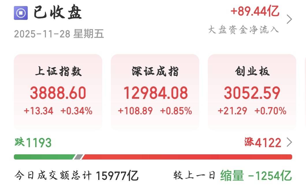 盘面看着回暖,但资金观望情绪没减。沪深两市全天成交额仅15858亿元,比前一日减少1240亿元。不过,个股端很热闹,两市超4100只股票飘红,81 只个股涨停,能源金属、船舶制造、化肥等板块轮番发力,中药、银行、保险少数几个板块逆势下跌,市场赚钱效应明显回升。 再看当日资金流向,成长赛道重新成了资金青睐的重点,三大板块主力资金净流入都超78亿元,热度拉满。锂电池概念表现最突出,主力资金净流入 88.47亿元,板块里11只股涨停、441只个股上涨,近期锂电池产业链多家企业实现满产满销,碳酸锂价格一个月涨超20%,甚至有不少下游企业签下长 期锁量订单,显示出市场对该板块长期需求具备信心。 机器人概念紧跟着发力,主力资金净流入84.92亿元,10只股涨停、超800只个股上涨,靠着具身智能商业化加速的利好,板块热度一直涨,成了科技赛 道里的核心主线之一。储能板块主力资金净流入78.11亿元,12只股涨停、600多只个股上涨。分析认为,行业景气度高、政策给支持、需求又爆发,几 大因素撑起了成长赛道的热度。 来源:川观新闻 川观新闻记者 彭瑀珩 11月28日,A股迎来11月最后一个交易日,三大指数集体收涨,给全月行情画上 ...