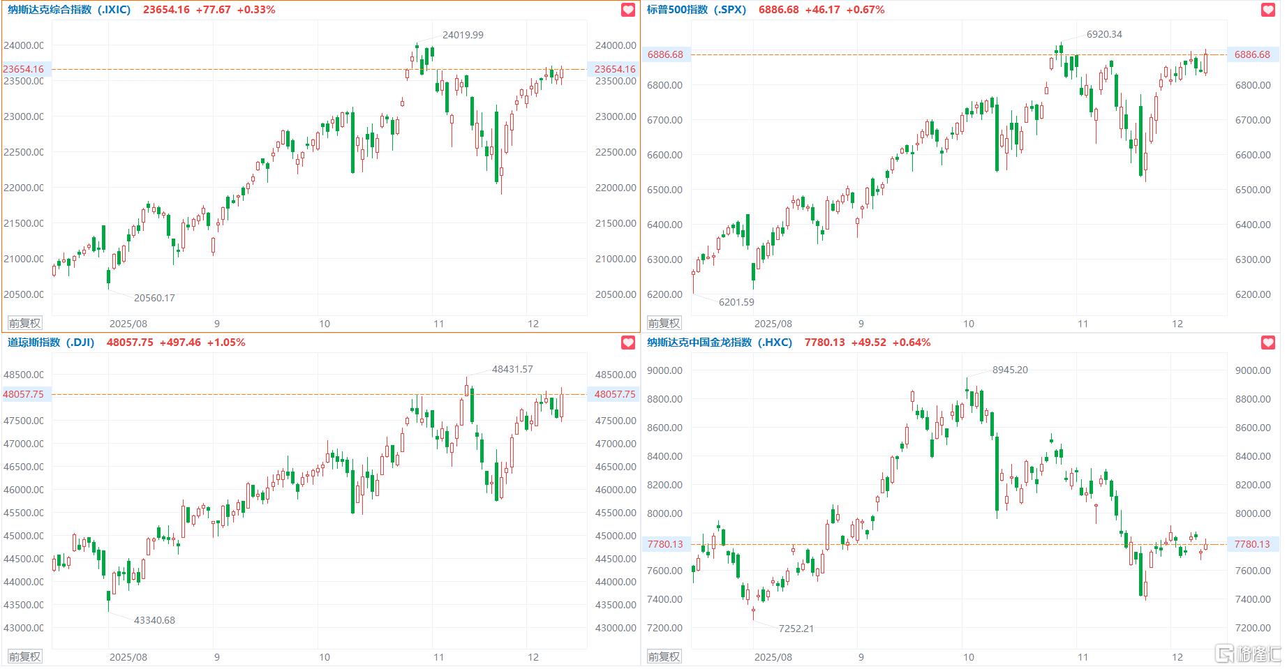 纳斯达克中国金龙指数收涨0.65%,热门中概股中,贝壳涨超3%,阿里巴巴、百度涨近2%,拼多多跌1.59%,小鹏汽车跌近1%,京东跌0.3%。 美联储如期宣布降息25个基点,并暗示未来将暂缓进一步降息,美股三大指数集体收涨,道指涨1.05%,纳指涨0.33%,标普500指数涨0.68%,大型科技股 多数上涨,特斯拉、亚马逊、博通、谷歌涨超1%,Meta跌超1%,微软跌超2%。 存储、储能概念股、基建股涨幅居前,GE Vernova涨超15%,Sandisk涨超6%,美光科技涨超4%,卡特彼勒涨超3%。加密货币、电子游戏与多媒体板块跌幅 居前,Roblox、游戏驿站跌超4%,Strategy跌超2%。 ...