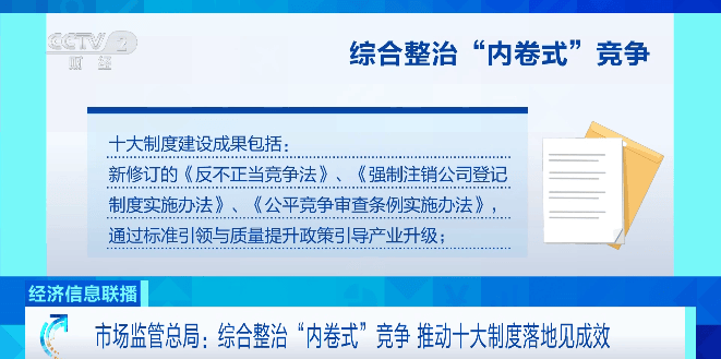 转载请注明央视财经 编辑:令文芳 记者了解到,十大制度建设成果涉及多个领域,包括:新修订的《反不正当竞争法》《强制注销公司登 记制度实施办法》《公平竞争审查条例实施办法》,通过标准引领与质量提升政策引导产业升级; 针 对当前市场竞争中较为突出、典型的"内卷"行为,出台《外卖平台服务管理基本要求》《关于提升网络 交易平台产品和服务质量的指导意见》; 对于涉及安全底线的领域,突出刚性约束,出台《网络销售 重点工业产品质量安全监督管理规定》;此外,成果还包括《互联网平台反垄断合规指引(征求意见 稿)》《新能源汽车、锂电池和光伏产业标准提升行动方案》《关于稳步扩大标准制度型开放的若干措 施》以及《关于进一步推进内外贸产品"同线同标同质"工作的公告》。一系列措施将进一步引导企业 从"同质化低效能"竞争转向"高质量高水平竞争",为各类经营主体创新发展提供坚实的制度保障。 市场监管总局竞争协调司副司长 赵春雷:从实施效果来看,这批制度已初步展现出协同发力的良好态 势。对不当干预行为的规范更加有力,市场竞争更加理性有序,平台"补贴大战""全网最低价"等现象得 到遏制,市场退出更加顺畅,"新三样"标准体系加快构建,有力推动企业 ...