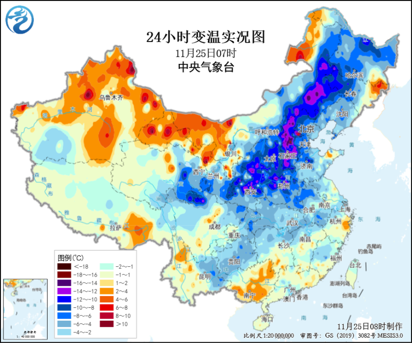 Group 1 - A significant drop in temperature has been observed across various regions in China, with some areas experiencing a decrease of over 14℃ [1][3] - The cold air mass is expected to continue affecting central and eastern China, with another wave of cold air arriving from November 25 to 27, leading to a temperature drop of 4 to 8℃ in most areas [3][4] - Strong winds are forecasted, with some regions experiencing gusts of 8 to 10 levels, prompting the issuance of a blue warning for strong winds by the Central Meteorological Observatory [3][4] Group 2 - The public is advised to pay attention to weather forecasts and warnings due to the frequent and strong cold air activities, which may lead to significant temperature fluctuations [4] - Precautions are recommended for safety when using heating devices, and individuals should avoid high-risk areas to prevent accidents related to falling objects [4]