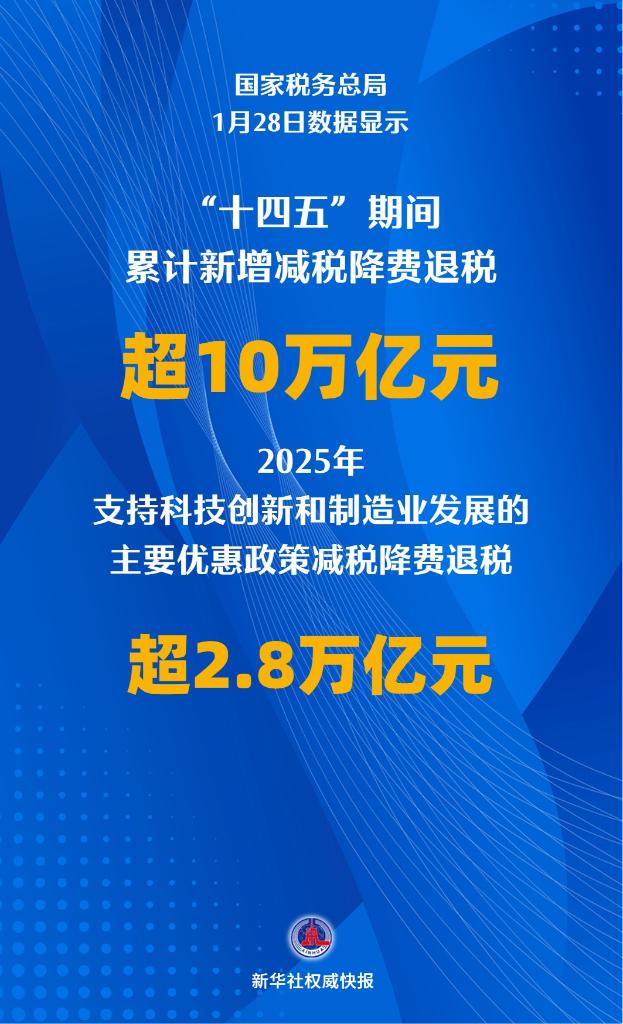 "十四五" 期间 累计新增减税降费退税 国家税务总局 1月28日数据显示 07月 亿元 nt l > TN 2025年 支持科技创新和制造业发展的 主要优惠政策减税降费退税 F12. BV 可 / 6 716 海报制作:刘开雄 新华社国内部出品 【纠错】 【责任编辑:薛涛】 新华社权威快报 记者1月28日从全国税务工作会议上获悉,在经济增长等因素带动下,2025年,税务部门全年征收 各项税费33.1万亿元,税费收入预算目标圆满完成。落实支持科技创新和制造业发展的主要优惠政策减 税降费退税超2.8万亿元。"十四五"期间,税务部门累计征收税费超156万亿元,约占全口径财政收入的 80%;累计新增减税降费退税超10万亿元,为经营主体发展壮大提供了有力支持。 记者:刘开雄 ...