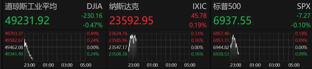 1月7日晚间,美股开盘后有所走弱。贵金属集体跳水,国际白银暴跌。 截至发稿,道琼斯指数跳水下跌,标普500指数亦转为下跌;纳斯达克综合指数涨幅回落。 | 道琼斯工业平均 | | | DJIA | 纳斯达克 | | | IXIC | 标普500 | | | SPX | | --- | --- | --- | --- | --- | --- | --- | --- | --- | --- | --- | --- | | 49231.92 | | | -230.16 | 23592.95 | | | 45.78 | | | | -7.27 | | | | | -0.47% | | | | 0.19% | 6937.55 | | | -0.10% | | 49703.27 | | | 0.49% | 23585.96 | | | 0.33% | 6957.40 | | | 0.18% | | 49582.67 | | | 0.24% | | | | 0.16% | 6951.11 / | | | 0.09% | | 49462.08 | | | 0.00% | 23547.17 | | | 0.00% | 6944. ...
