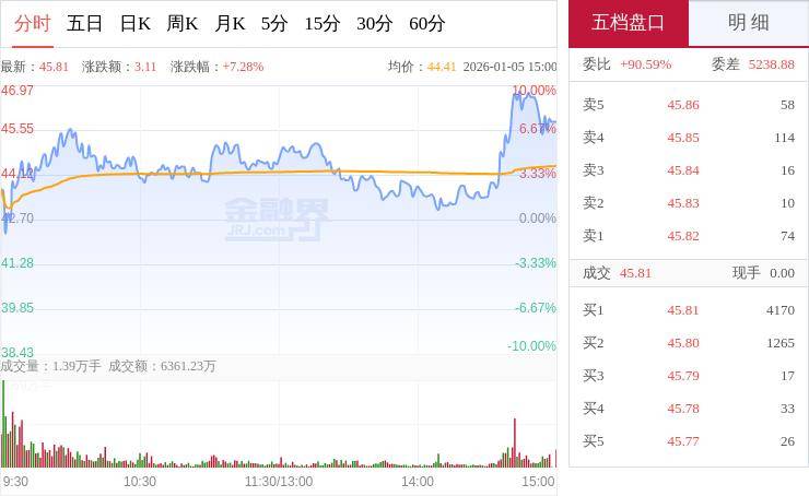 交易所数据显示,通宇通讯1月5日股价高开后快速下探,随后震荡回升,上午盘中展开冲高走势;下午 盘中一度回落调整,尾盘阶段出现大幅拉升,最终收盘涨幅显著。整体来看,股价经历了先下探再回 升、午后回落调整后尾盘发力拉升的过程,尾盘阶段上攻动能较强,走势呈现明显的先抑后扬特征。 | 分时 | 五日 日K 周K 月K 5分 15分 30分 60分 | | 五档盘口 | | 明细 | | --- | --- | --- | --- | --- | --- | | 最新:45,81 | 涨跌额:3.11 涨跌幅:+7.28% | 均价:44.41 2026-01-05 15:00 | 委比 +90.59% | | 委差 5238.88 | | 46.97 | | | 英5 | 45.86 | 58 | | 45.55 | | 6.674 | | | | | | NN | | 卖4 | 45.85 | 114 | | | | 3.33% | 卖3 | 45.84 | 16 | | 2,70 | | 0.00% | 卖2 | 45.83 | 10 | | | | | 卖I | 45.82 | 74 | | 41.28 | | ...