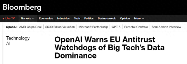 OpenAI提醒欧盟反垄断机构 警惕科技巨头掌控数据主导权