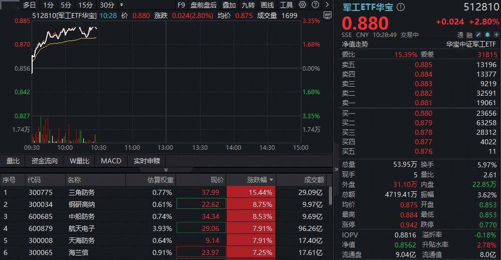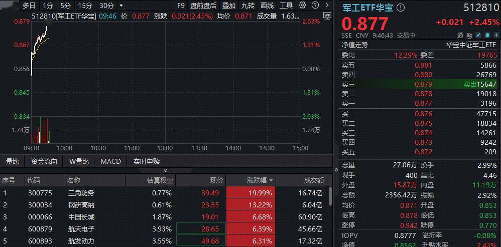 ETF盘中资讯|军工异动,三角防务20CM涨停!高人气军工ETF华宝(512810)直线冲高2.45%