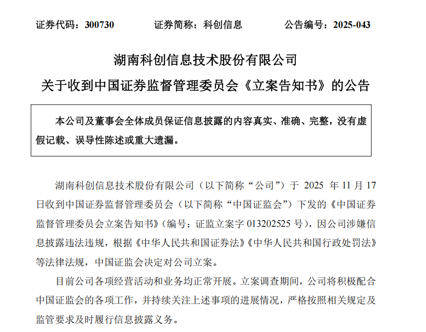 Core Points - The company, Kexin Information, has received a notice from the China Securities Regulatory Commission (CSRC) regarding an investigation into suspected violations of information disclosure laws [1] - The company is currently operating normally and will cooperate with the CSRC during the investigation while adhering to disclosure obligations [1] Financial Adjustments - In April 2023, Kexin Information corrected financial data for 13 financial reports from Q3 2022 to Q3 2024 due to accounting errors [3] - The 2022 annual report adjustments included a reduction in accounts receivable from 283 million to 275 million, a decrease in revenue from 538 million to 528 million, and a drop in net profit from 24.78 million to 23.94 million [3] Legal Issues - The company is involved in an ongoing investigation related to a contract fraud case exceeding 100 million [4] - Kexin Information reported a contract worth 111 million with Dayou Technology, which has not received full payment after an initial payment of 4.45 million [4] - The police have initiated an investigation into the alleged contract fraud case as of July 2024 [5] Financial Performance - Kexin Information reported a net loss of 162 million in 2023, reversing from profit to loss, and a further loss of 63.82 million in 2024 [5] - For the first three quarters of 2025, the company reported revenue of 93.65 million, a year-on-year decline of 36.58%, with a net loss of 58.84 million [5]