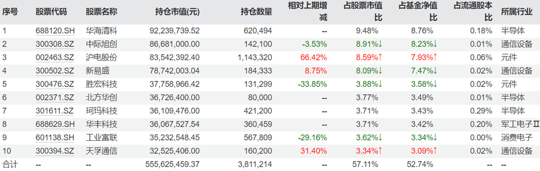 | 序号 | 股票代码 | 股票名称 | 持仓市值(元) | 持仓数量 | 相对上期增 | 占股票市值 | 占基金净值 | 占流通股本 Company of the program and | | --- | --- | --- | --- | --- | --- | --- | --- | --- | | | | | | | | ER | FR | | | 1 | 688120.SH | 华海清科 | 92,239,739.52 | 620.494 | - | 9.48% | 8.76% | 0.18% 半导体 | | 2 | 300308.SZ | 中际旭创 | 86.681.000.00 | 142.100 | -3.53% | 8.91%↓ | 8.23% | 0.01% 通信设备 | | 3 | 002463.SZ | 沪电股份 | 83.542.392.40 | 1.143.320 | 66.42% | 8.59%1 | 7.93%1 | 0.06% 元件 | | 4 | 300502.SZ | 新易醫 | 78.742.003.04 | 184,333 | 8.75% | 8.09%↓ | 7. ...