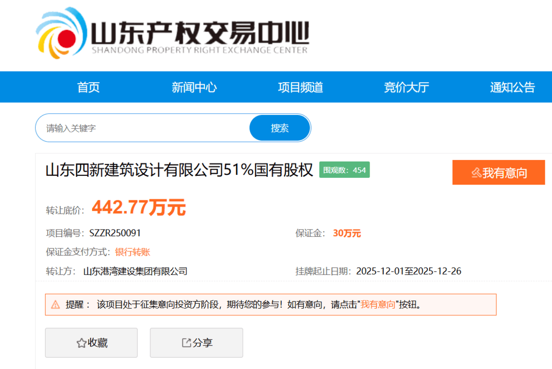 12月1日,山东四新建筑设计有限公司(下称"四新建筑设计")51%国有股权在山东产权交易中心挂牌转让,转让底价442.77万元,转让方为山东港湾建设 集团有限公司(下称"山东港湾")。 经济导报记者 刘勇 如今,在持续深化国企改革的背景下,此次股权转让也被视为是山东省港口集团优化产业布局、聚焦主责主业的又一具体举措。 山东港湾成立于2001年,注册地位于山东省日照市,注册资本19.75亿元,法定代表人邹德健。 从股权结构看,山东港湾的控股股东是山东港口日照港集团有限公司,持股比例为57.8804%,其余股东包括山东省港口集团有限公司、中交天津航道局 有限公司、青岛港国际股份有限公司、山东港口烟台港集团有限公司和山东港口青岛港集团有限公司,持股比例分别为5.1933%、13.0235%、9.2926%、 4.553%和0.0571%。 山东港湾官网显示,该公司隶属于山东省港口集团有限公司,是一家战略清晰、管理完善、技术领先的综合性国有大型工程总承包企业,致力于全力打 造"港航特色、全国领先的基础设施综合服务商"。 转让信息显示,四新建筑设计成立于1995年,注册资本612.24万元,注册地位于青岛,法定代表人刘 ...