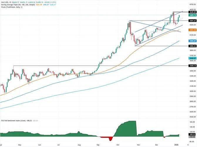 市场解读: 1月7日,在全球地缘政治紧张局势急剧升温的背景下,黄金作为传统避险资产的表现异常亮眼。周二, 现货黄金价格延续了前一交易日的涨势,进一步上涨约1%,收盘于4494美元每盎司。周三(1月7日) 亚市早盘,现货黄金高位震荡,截止07:30,一度触及4500.27美元/盎司,这一价格水平已经非常接近 去年12月24日创下的4549.71美元每盎司的历史最高纪录。与此同时,2月交割的美国黄金期货也上涨 1%,收报4496.10美元每盎司。黄金价格的这一波上涨,主要源于投资者对全球不确定性的担忧大幅增 加,特别是周末美国对委内瑞拉的军事行动引发了广泛的避险情绪,推动资金大量流入贵金属市场。 黄金技术分析: 黄金当前长期上涨趋势未发生根本性转变,上方前期高点4550一线尚未形成有效试探,且行情自低位上 行以来,始终未出现具备规模的调整行情,技术结构上尚未构筑明确顶部形态。从趋势延续性来看, 4500关口并非本轮上涨的终点,在顶部信号未确认前,逆势看空或博弈调整均缺乏技术逻辑支撑,多头 节奏仍需持续跟进。 日线级别:本周连阳上涨态势正式启动,多头动能释放充分,当前趋势强度处于高位。若周三延续收阳 格局,价格将直 ...