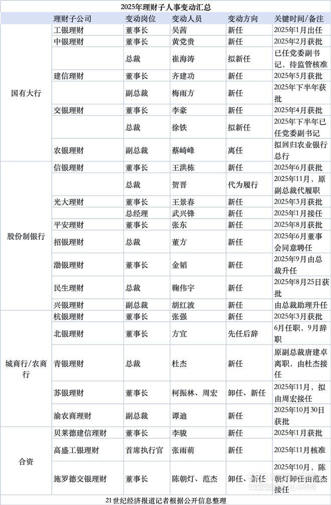 21世纪经济报道记者 吴霜 理财子诞生6年后,行业集中迎来"第二代"甚至第三代管理团队。 行业转型深水区内,据21世纪经济报道记者不完全统计,今年以来,31家理财子中已经有20家理财公司 核心管理层更迭,高管在集团内调、跨机构流动成主线。 | | | | 2025年理财子人事变动汇总 | | | | --- | --- | --- | --- | --- | --- | | | 理财子公司 工银理财 | 变动岗位 董事长 | 变动人员 吴茜 | 变动方向 新任 | 关键时间/备注 2025年1月出任 | | | 中银理财 | 重事长 | 黄党贵 | 新任 | 2025年2月获批 | | | | 总裁 | 崔海涛 | 拟新任 | 已任党委副书 记,待监管核准 | | | 建信理财 | 董事长 | 齐建功 | 新任 | 2025年5月获批 | | 国有大行 | | 副总裁 | 梅雨方 | 新任 | 2025年下半年获 | | | | | | | 批 | | | 交银理财 | 董事长 | 李蒙 | 新任 | 2025年4月获批 | | | | 总裁 | 徐铁 | 拟新任 | 2025年下半年已 | | | | | ...