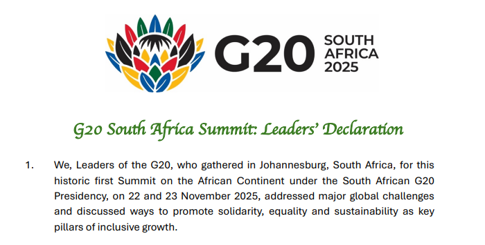 Core Points - The G20 summit in Johannesburg successfully adopted a joint declaration despite pressure from the United States, marking the first time a declaration was passed on the opening day of the summit [1][3] - The declaration emphasizes the importance of multilateral cooperation to address global challenges and calls for increased support for developing countries to promote inclusive growth and sustainable development [2][5] Group 1 - The declaration consists of 122 points, highlighting the urgency of climate action and the commitment to triple global renewable energy capacity [2][5] - It includes a commitment to strengthen debt management mechanisms to alleviate the high debt burden faced by developing countries [5] - The declaration reiterates the importance of multilateralism and calls for countries to work together to tackle common global challenges [5] Group 2 - South Africa's government has expressed a willingness to maintain cooperation with the United States, despite the latter's absence from the summit [2] - The transition of the G20 presidency to the United States will not occur at the summit due to the lack of appropriate representation from the U.S. [2]