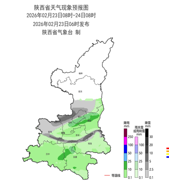 今天(2月23日)是春节假期最后一天,各地迎来返程高峰。起点新闻·西部网记者从陕西省气象台了解 到,预计今天白天陕西中南部有雨雪天气,延安南部局地、关中北部及西部中到大雪或雨夹雪转多云, 秦巴山区、商洛北部有雨夹雪或中到大雪。 2月23日—24日陕 西省天气现象预报图 据了解,2月22日6时—23日6时陕西共有71个区县629个监测站出现降水,西安城区最大3.3毫米。延安 黄龙2.8,铜川耀州7.2,咸阳永寿8.5,宝鸡太白14.8,西安周至11.5,渭南合阳9.4,汉中南郑23.7,安 康平利18.7,商洛洛南0.2,杨凌0.3。昨日全省大部最高气温较前一日下降,其中陕北东部下降6~ 10℃,降幅最大为宜川10.4℃。昨日全省最高气温5~25℃,西安站17.8℃。 今晨陕北北部和东部、关中大部最低气温较昨晨明显下降,陕北部分、关中局部共35个区县496监测站 最低气温低于0℃,最低气温分布:陕北-17~5℃,最低神木圪丑沟站-17.2℃;关中-3~11℃,最低长安 光头山站-3.3℃,西安站7.0℃;陕南-1~16℃,最低留坝西岭站-0.6℃。昨日至今晨榆林北部、秦岭山区 部分等共18区县23站出现7级(1 ...