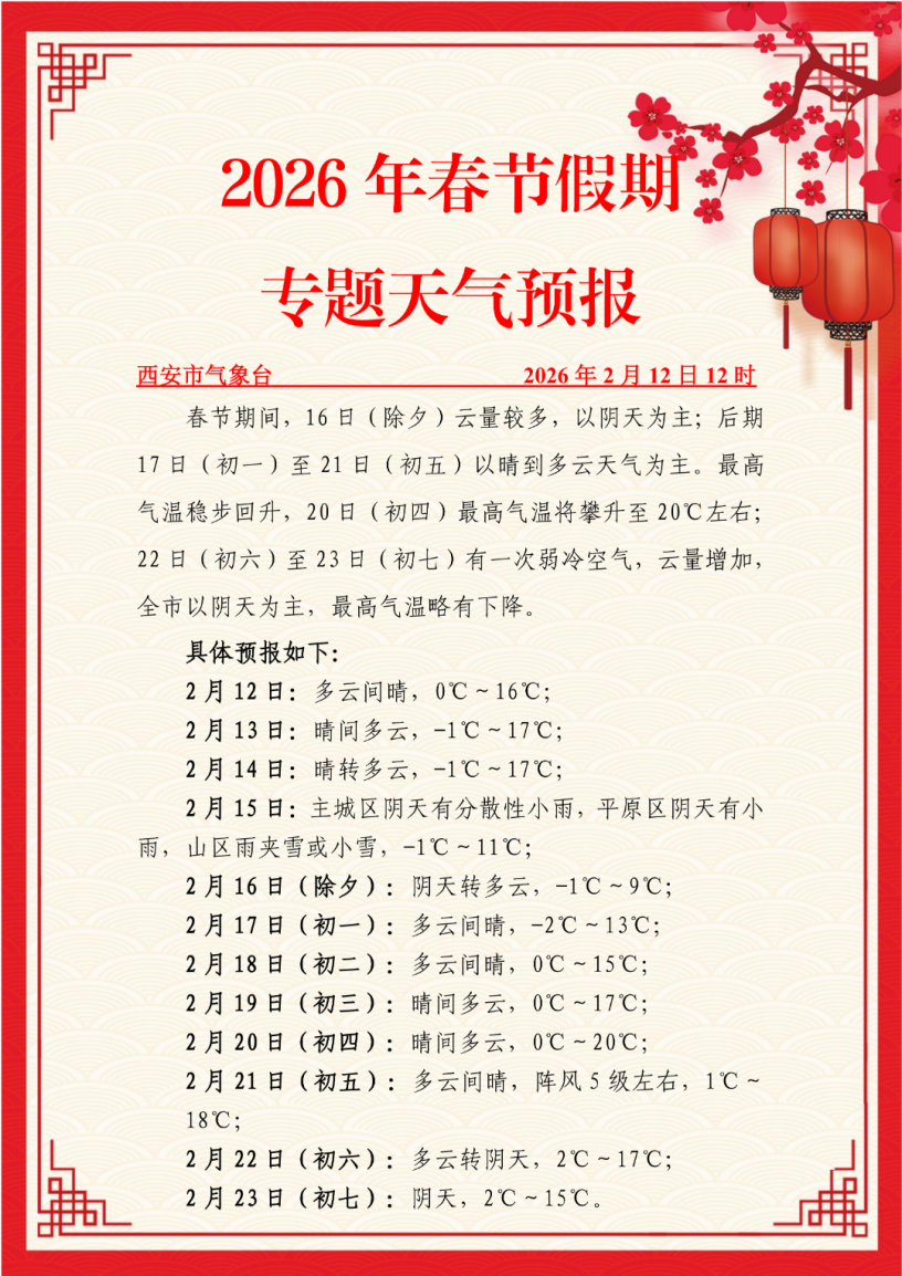 来源:起点新闻 春节假期西安天气如何? 西安气象台发布 专题气象预报 2026 年春节假期 专题天气预报 西安市气象台 2026年2月12日12时 春节期间,16日(除夕)云量较多,以阴天为主;后期 17日(初一)至21日(初五)以晴到多云天气为主。最高 气温稳步回升,20日(初四)最高气温将攀升至20℃左右; 22日(初六)至23日(初七)有一次弱冷空气,云量增加, 全市以阴天为主,最高气温略有下降。 具体预报如下: 2月12日:多云间晴,0℃~16℃; 2月13日:晴间多云,-1℃~17℃; 2月14日:晴转多云,-1℃~17℃; 2月15日:主城区阴天有分散性小雨,平原区阴天有小 雨,山区雨夹雪或小雪,-1℃~11℃; 2月16日(除夕):阴天转多云,-1℃~9℃; 2月17日(初一):多云间晴,-2℃~13℃: 2月18日(初二):多云间晴,0℃~15℃; 2月19日(初三):晴间多云,0℃~17℃: 2月20日(初四):晴间多云,0℃~20℃; 2月21日(初五):多云间晴,阵风5级左右,1℃~ 18℃: 2月22日(初六):多云转阴天,2℃~17℃; 2月23日(初七):阴天,2℃~15℃。 西安 ...