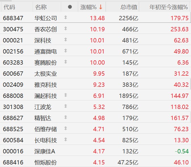 消息面上,央视财经称,过去半年全球存储芯片价格持续上涨。CFM闪存市场近日发布2025年Q4存储 市场展望报告。报告指出,预计四季度,服务器eSSD涨幅将达到10%以上,DDR5 RDIMM价格涨幅约 10%~15%。 责任编辑:栎树 | 代码 | 名称 | | 涨幅% ↓ | 总市值 | 年初至今涨幅% | | --- | --- | --- | --- | --- | --- | | 688347 | 中红公司 | 1 | 13.48 | 2256 乙 | 179.75 | | 300475 | 香农芯创 | 1 | 10.19 | 466亿 | 253.63 | | 000021 | 深科技 | + | 10.01 | 481亿 | 62.63 | | 002156 | 通富微电 | + | 10.01 | 671亿 | 49.80 | | 603283 | 塞腾股份 | 1 | 10.00 | 145亿 | 6.36 | | 600667 | 太极实业 | | 9.95 | 187亿 | 31.22 | | 002409 | 雅克科技 | | 9.23 | 383亿 | 40.32 | | 68800 ...