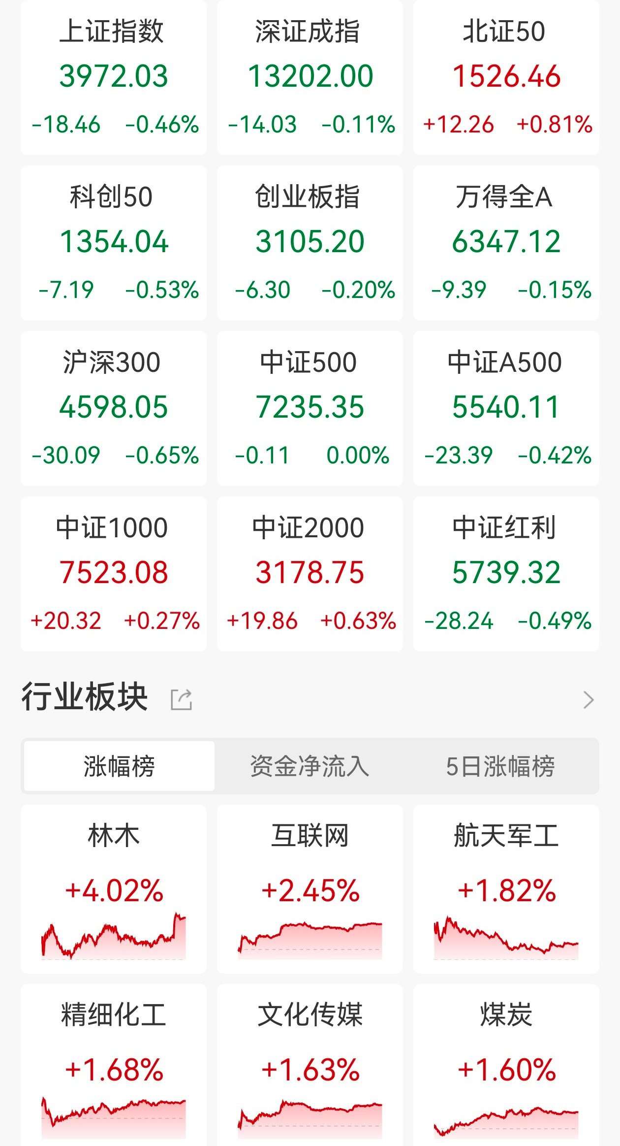 | 上证指数 | 深证成指 北证50 | | --- | --- | | 3972.03 13202.00 1526.46 | | | -18.46 -0.46% -14.03 -0.11% +12.26 +0.81% | | | 科创50 | | | 1354.04 | 3105.20 6347.12 | | -7.19 -0.53% -6.30 -0.20% -9.39 -0.15% | | | 沪深300 | 中证500 中证A500 | | 4598.05 7235.35 5540.11 | | | -30.09 -0.65% -0.11 0.00% -23.39 -0.42% | | | 中证1000 | | | 7523.08 3178.75 5739.32 | | | +20.32 +0.27% +19.86 +0.63% -28.24 -0.49% | | | 行业板块 | | | 涨幅榜 | 资金净流入 5日涨幅榜 | | 林木 | 互联网 航天军工 | | +4.02% | +2.45% +1.82% | | 精细化工 | 文化传媒 煤炭 | | +1.68% | +1.63% +1.60 ...