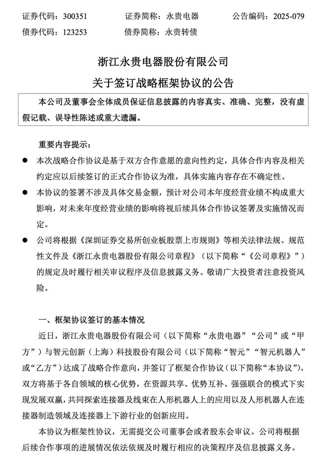 Core Viewpoint - Yonggui Electric has entered into a strategic cooperation intention with Zhiyuan Innovation (Shanghai) Technology Co., Ltd., focusing on the application of connectors and wiring harnesses in humanoid robots and vice versa [1][5]. Summary by Sections Framework Agreement Signing - Yonggui Electric and Zhiyuan Innovation have signed a framework cooperation agreement aimed at leveraging each other's core strengths through resource sharing and complementary advantages [5]. - The agreement is a framework agreement and does not require approval from the company's board of directors or shareholders [5]. Impact on Business Performance - The strategic cooperation agreement is based on the willingness to collaborate and is an intention-based arrangement, with specific cooperation details to be defined in future formal agreements [6]. - The agreement does not involve specific transaction amounts and is expected to have no significant impact on the company's current year operating performance; the impact on future years will depend on subsequent agreements and implementation [6].