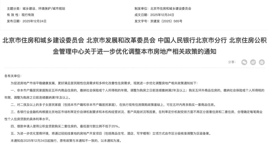 二、对二孩及以上的多子女居民家庭(包括本市户籍和非本市户籍居民家庭),在执行现有住房限购政 策基础上,可在五环内再多购买一套商品住房。 三、各银行业金融机构根据北京地区市场利率定价自律机制要求和本机构经营状况、客户风险状况等因 素,在利率定价机制安排方面不再区分首套住房和二套住房,合理确定每笔商业性个人住房贷款的具体 利率水平。 四、借款申请人使用公积金贷款购买二套住房的,最低首付款比例不低于25%。 北京市住房和城乡建设委员会、北京市发展和改革委员会、中国人民银行北京市分行、北京住房公积金 管理中心发布关于进一步优化调整本市房地产相关政策的通知。 一、非本市户籍居民家庭购买五环内商品住房的,缴纳社会保险或个人所得税的年限,调整为购房之日 前连续缴纳满2年及以上;购买五环外商品住房的,缴纳社会保险或个人所得税的年限,调整为购房之 日前连续缴纳满1年及以上。 本通知自2025年12月24日起施行,原有政策与本通知不一致的,以本通知为准。 来源|北京市住房和城乡建设委员会网站 编辑 |瑜见 五、为进一步优化营商环境,将通过招拍挂拿地的房地产开发项目(包括商品住宅、酒店、写字楼等) 立项方式由市区分级核准调整为区级 ...
