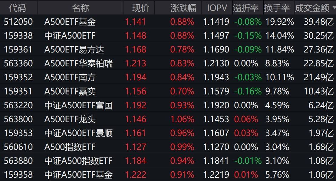 市场早盘震荡反弹,中证A500指数上涨0.89%。盘面上热点快速轮动,抗流感概念股爆发,算力硬件概念快速拉升,AI应用概念延续强势;下跌方面,军工 板块走弱。 有券商表示,上周由于美联储降息预期出现反复,年底部分机构投资者选择锁定年度收益和排名,市场波动有所加大。但中长期看,支撑本轮A股上涨的基 础并未发生转变。预计上证指数围绕4000点附近蓄势整固的可能性较大,市场风格再平衡仍将延续,周期与科技有望轮番表现。 | 代码 | 名称 | 现价 | 涨跌幅 | IOPV 溢折率 换手率 成交金额 | | | --- | --- | --- | --- | --- | --- | | 512050 | A500ETF基金 | 1.141 | 0.88% | 1.1419 -0.08% 19.92% | 39.48/Z | | 159338 | 中证A500ETF | 1.148 | 0.88% | 1.1497 -0.15% 14.04% | 30.25 Z | | 159361 | A500ETF易方达 | 1.168 | 0.78% | 1.1690 -0.09% 11.84% | 27.36 Z | | 56 ...