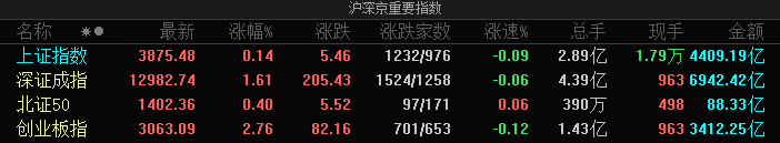 凤凰网财经讯 11月26日,市场早盘震荡反弹,截至午间收盘,沪指涨0.14%,深成指涨1.61%,创业板 指涨2.76%。沪深两市半日成交额1.14万亿,较上个交易日缩量390亿。 | | | | | 沪深京重要指数 | | | | | --- | --- | --- | --- | --- | --- | --- | --- | | 名称 *● | 最新 | 涨幅% | | | 涨跌 涨跌家数 涨速% 总手 | | 现手 金额 | | 上证指数 | 3875.48 | 0.14 | 5.46 | 1232/976 | -0.09 | 2.89亿 | 1.79万 4409.19亿 | | 深证成指 | 12982.74 | 1.61 | 205.43 | 1524/1258 | -0.06 | 4.39 7. | 963 6942.42 7. | | 北证50 | 1402.36 | 0.40 | 5.52 | 97/171 | 0.06 | 390万 | 498 88.33 乙 | | 创业板指 | 3063.09 | 2.76 | 82.16 | 701/653 | | -0.12 1.43 7. | 9 ...