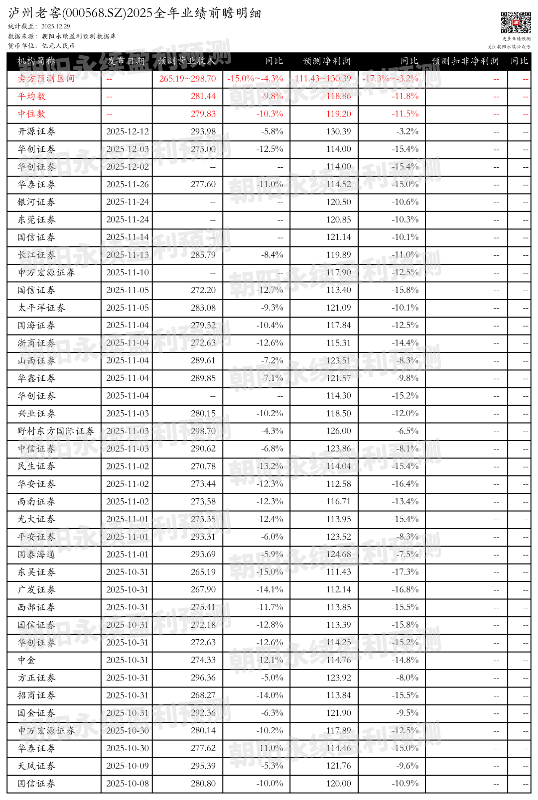 1. 泸州老窖全年业绩预期怎么样? 截至2025年12月29日,根据朝阳永续季度业绩前瞻数据: 预测公司Q4一致预期营业收入265.19~298.70亿元,同比变动-15.0%~-4.3%; 预测公司Q4一致预期净利润111.43~130.39亿元,同比变动-17.3%~-3.2%。 关注后续财报数据披露后能否超预期,朝阳永续A股季度业绩前瞻数据将为投资者提供业绩鉴定。 | 构向称 | | 预测营业收入 | 同比 | 预测净利润 | 同比 | 预测 扣非净利润 은 | | --- | --- | --- | --- | --- | --- | --- | | 方预测区间 | | 265.19~298.70 | -15.0%~-4.3% | 111.43~130.39 | -17.3%~-- 3.2% | - | | 均数 | - | 281.44 | -9.8% | 7 118.86 | -11.8% | - | | 位数 | -- | 279.83 | -10.3% | 119.20 | -11.5% | - | | 源证券 | 2025-12-12 | 293.98 | -5.8% | 130.39 | ...