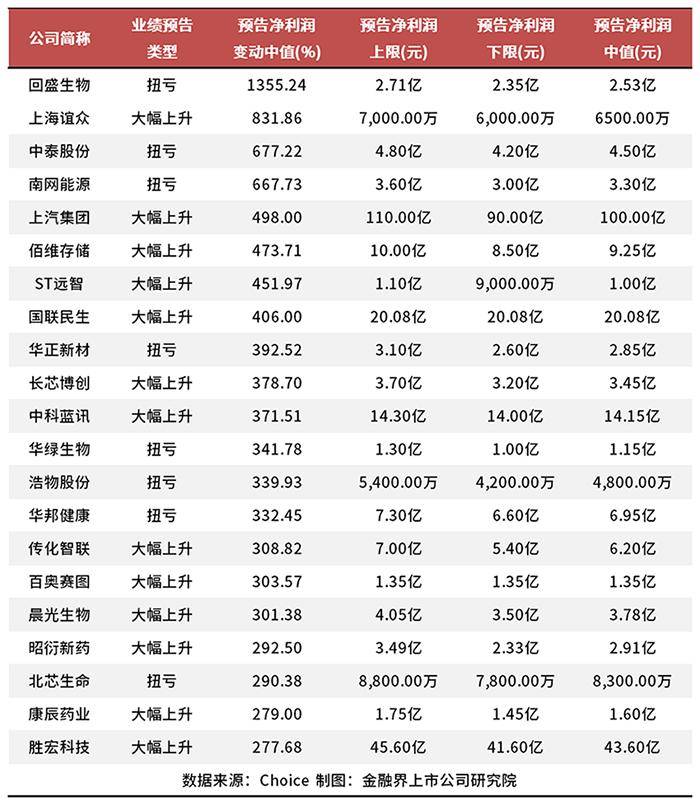 | 公司简称 | 业绩预告 | 预告净利润 | 原因为利润 | 预告净利润 | 预告净利润 | | --- | --- | --- | --- | --- | --- | | | 类型 | 变动中值(%) | 上限(元) | 下限(元) | 中值(元) | | 回盛生物 | 扭弓 | 1355.24 | 2.71亿 | 2.35亿 | 2.53亿 | | 上海谊众 | 大幅上升 | 831.86 | 7,000.00万 | 6,000.00万 | 6500.00万 | | 中泰股份 | 扭亏 | 677.22 | 4.80亿 | 4.20亿 | 4.50亿 | | 南网能源 | 扭亏 | 667.73 | 3.60亿 | 3.00亿 | 3.30亿 | | 上汽集团 | 大幅上升 | 498.00 | 110.00亿 | 90.00亿 | 100.00亿 | | 佰维存储 | 大幅上升 | 473.71 | 10.00亿 | 8.50亿 | 9.25亿 | | ST远智 | 大幅上升 | 451.97 | 1.10亿 | 9,000.00万 | 1.00亿 | | 国联民生 | 大幅上升 | 406.00 | ...