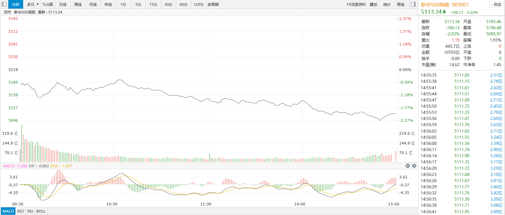 (文章来源:新华财经) 走势上看,新华500指数(989001)10日早间低开,指数全天震荡调整,最终明显收跌。指数盘中最高触及5196.48点,最低触及5095.97点,成分股全天总成 交额报10703亿元,成交额较上一交易日有所减少。 成分股方面,江西铜业、国信证券、扬杰科技、长春高新等成分股涨幅居前;先导智能、亿纬锂能、晶盛机电、璞泰来等成分股跌幅靠前。 新华财经北京10月10日电(胡晨曦)新华500指数(989001)10月10日收盘跌2.03%,报5113.34点。 ...