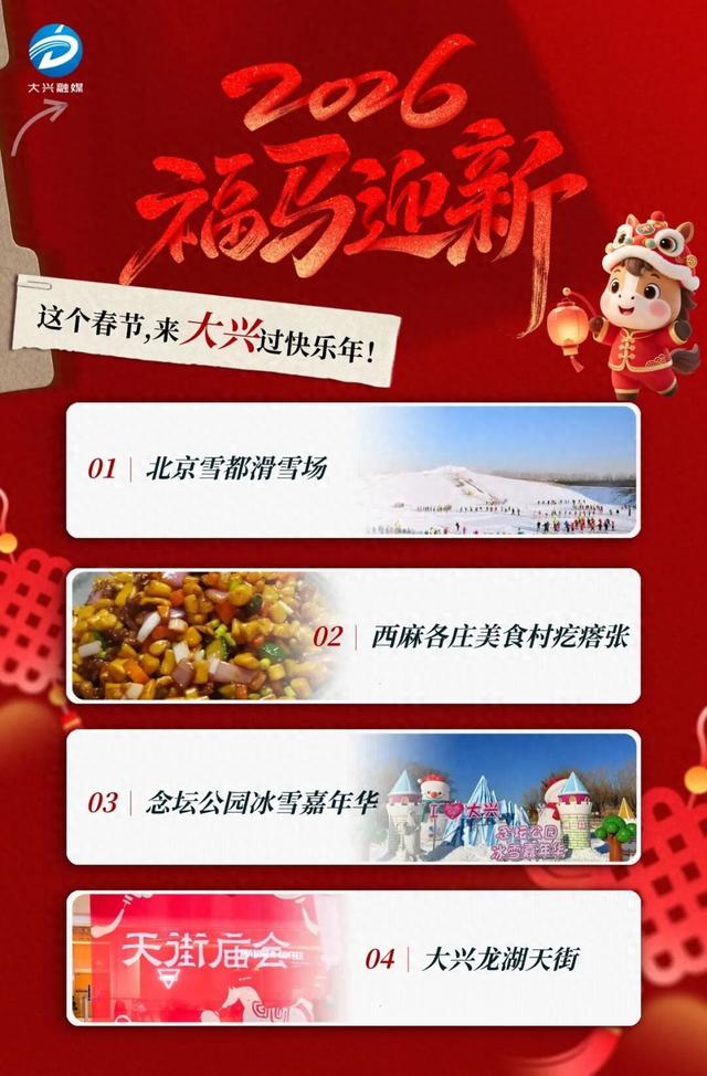 新春将至,年味渐浓 新春之约! 冰雪狂欢、暖汤康养、童趣遛娃 大兴这三大主题线路 一站式解锁新年美好 冰雪动感之旅 新春潮玩冰雪狂欢 从专业滑雪到趣味戏雪动静结合 搭配年味美食与商圈潮逛 解锁新春冰雪欢乐时光 北京雪都滑雪场 10余条雪道满足不同水平,可体验滑雪、雪圈、雪地摩托等项目;小兴兴建议您在"大众点评"等小程序 上提前预订滑雪票,自带保暖装备,雪场提供雪具租赁。 西麻各庄美食村疙瘩张 京南首店,主打老北京炭火铜锅涮肉、炒疙瘩和传统小吃,滑雪后来顿热乎乎的美食,超满足!距离雪 都滑雪场步行10分钟,停车方便。 念坛公园冰雪嘉年华 邀您走进国门新城 赴一场年味十足、欢乐满满的 3万㎡超大冰雪天地,含雪地陀螺、飞碟、挖掘机等十余个项目,无动力项目区适合小朋友,这里还有 雪乡木屋实景搭建,打卡拍照超出片。 大兴龙湖天街 南城热门商圈,汇集多元暖冬美食与各类人气餐饮,饭后还可逛潮牌店铺;地铁4号线直达,停车免费2 小时。 暖冬康养之旅 从热带风情赏景到温泉暖意放松 再邂逅璀璨新春灯海 全程温暖惬意,尽享康养年味时光 龙熙温泉水世界 众多特色泡池,室内外温泉结合,泡汤超惬意,含中药池、玫瑰池、鱼疗池等,负氧离子含 ...