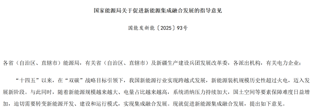 据国家能源局网站消息,日前,国家能源局发布关于促进新能源集成融合发展的指导意见。其中提出, 到2030年,集成融合发展成为新能源发展的重要方式,新能源可靠替代水平明显增强,市场竞争力显著 提升,有力支撑经济社会发展全面绿色转型,为加快中国式现代化建设提供更加安全可靠的绿色能源保 障。详情如下: 国家能源局关于促进新能源集成融合发展的指导意见 国能发新能〔2025〕93号 各省(自治区、直辖市)能源局,有关省(自治区、直辖市)及新疆生产建设兵团发展改革委,各派出机 构,有关电力企业: "十四五"以来,在"双碳"战略目标引领下,我国新能源行业实现跨越式发展,新能源装机规模历史性超 过火电,迈入发展新阶段。与此同时,随着新能源规模越来越大、电量占比越来越高,系统消纳压力持 续加大,国土空间等要素保障难度日益增加,迫切需要转变新能源开发、建设和运行模式,实现集成融 合发展。现就促进新能源集成融合发展,提出如下意见。 一、总体要求 力自主、可靠供应能力,促进农村地区新能源就地就近消纳利用。支持在海岛等地区推动海洋能多能互 补发展,提升海洋能消纳保障服务能力。 (四)推动新能源一体化聚合运营。持续提升新能源发电功率预测精 ...