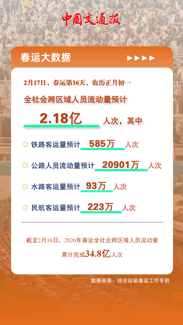 春运大数据 2月17日,春运第16天,农历正月初一 全社会跨区域人员流动量预计 2.18亿 人次,其中 ◎ 铁路客运量预计 585万 | 人次 ◎ 公路人员流动量预计_ 20901万 | 人次 ◎ 水路客运量预计_93万 人次 ◎ 民航客运量预计_223万 | 人次 2月17日,春运大数据→ 来自综合运输春运工作专班数据显示,预计2月17日(春运第16天,农历正月初一),全社会跨区域人 员流动量21802万人次,其中 铁路客运量预计585万人次 公路人员流动量预计20901万人次(高速公路及普通国省道非营业性小客车人员出行量预计19487万 人次;公路营业性客运量预计1414万人次) 水路客运量预计93万人次 民航客运量预计223万人次 截至2月16日,2026年春运全社会跨区域人员流动量 累计完成34.8亿人次 数据来源:综合运输春运工作专班 截至2月16日,2026年春运全社会跨区域人员流动量累计完成348088.4万人次。 来源:中国交通报 ...