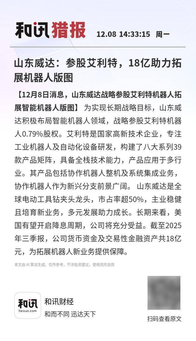 【12月8日消息,山东威达战略参股艾利特机器人拓展智能机器人版图】为实现长期战略目标,山东威 达积极布局智能机器人领域,战略参股艾利特机器人0.79%股权。艾利特是国家高新技术企业,专注工 业机器人及自动化设备研发,构建了八大系列39款产品矩阵,具备全栈技术能力,产品应用于多行业。 其产品包括协作机器人整机及系统集成业务,协作机器人作为新兴分支前景广阔。 山东威达是全球电 动工具钻夹头龙头,市占率超50%,主业稳健且培育新业务,多元发展助力成长。长期来看,美国有望 开启降息周期,公司将充分受益。截至2025年三季报,公司货币资金及交易性金融资产共18亿元,为拓 展机器人新业务提供保障。 本文由 Al 算法生成,仅作参考,不涉投资建议,使用风险自担 本文由 AI 算法生成,仅作参考,不涉投资建议,使用风险自担 和讯财经 FOL hexun.con 和而不同 迅达天下 扫码查看原文 ...