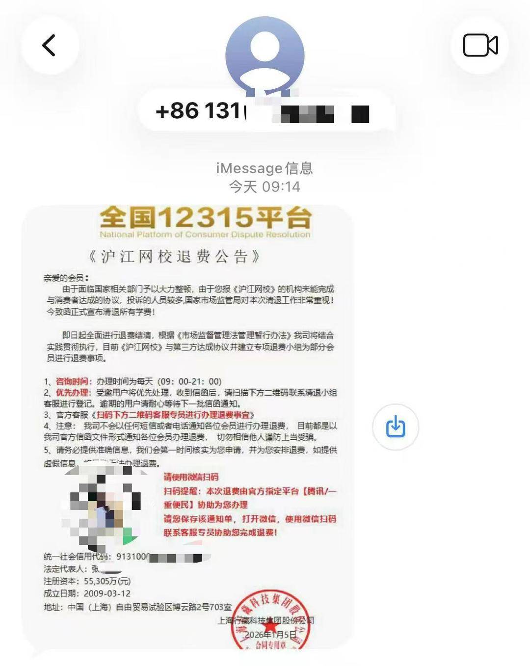 "突然收到一条退费公告短信,标题还写着全国12315发布,这是什么情况?"近日,南京市民刘女士(化名)向扬子晚报/紫牛新闻记者反映,自己收到一 条落款为沪江网校关联公司的退费短信,短信详细描述了退费依据和流程,还附有小程序二维码引导办理。但令刘女士疑惑的是,她从未在该平台充值消 费,且短信发送号码为归属地云南的私人手机号。沪江网校官方客服对此回应称:"我们从未泄露任何学员信息,这是常见的电信诈骗手法,如已受骗, 请立即报警。"记者搜索发现,此类退费诈骗并非个例,已有多地市民遭遇类似骗局。 记者看到,刘女士收到的这份"沪江网校退费公告"称:"由于您报《沪江网校》的机构未能完成与消费者达成的协议,投诉的人员较多……即日起全面进 行退费结清,根据《市场监督管理法管理暂行办法》我司将结合实践贯彻执行,目前《沪江网校》与第三方达成协议并建立专项退费小组为部分会员进行 退费事项。"此外,公告要求受邀用户扫描附带的小程序二维码,联系客服专员办理退费。 刘女士回忆,自己此前虽然的确注册过沪江网校账号,但从未充值或报名任何课程,"而且我也已经好几年没用过这个平台了,不知道何来退费一说"。此 外,刘女士还注意到,该条短信的发送方 ...