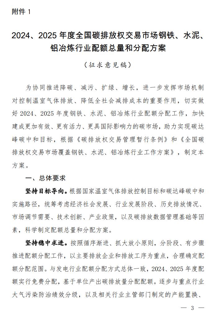 生态环境部公开征求《2024、2025年度全国碳排放权交易市场钢铁、水泥、铝冶炼行业配额总量和分配方案》意见