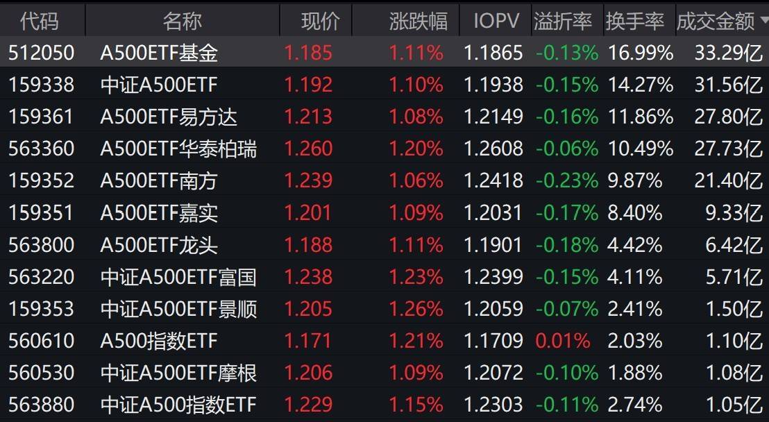 市场早盘震荡走强,中证A500指数上涨1.33%,2只中证A500相关ETF成交额超31亿元
