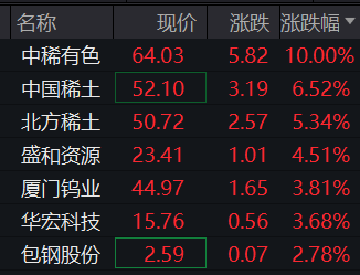 早盘,稀土永磁板块表现活跃,中稀有色涨停,中国稀土涨超6%,北方稀土涨超5%。 | 名称 | 现价 | 涨跌 涨跌幅▼ | | --- | --- | --- | | 中稀有色 | 64.03 | 5.82 10.00% | | 中国稀土 | 52.10 | 3.19 6.52% | | 北方稀土 | 50.72 | 2.57 5.34% | | 盛和资源 | 23.41 | 1.01 4.51% | | 厦门钨业 | 44.97 | 1.65 3.81% | | 华宏科技 | 15.76 | 0.56 3.68% | | 包钢股份 | 2.59 | 0.07 2.78% | 消息面上,根据《中华人民共和国出口管制法》等法律法规有关规定,为维护国家安全和利益、履行防扩散等国际义务, 商务部决定加强两用物项对日本出口管制。 受影响分析: 稀土开采冶炼:作为稀土永磁产业链的上游环节,稀土开采与冶炼企业掌握着核心资源储备与产能。随着出口管制收紧, 国内稀土产品定价话语权将进一步提升,拥有合规开采资质和稳定产能的企业将充分享受产品涨价带来的利润增厚,行业 头部企业的资源价值将得到重估。 稀土永磁材料加工:中游加工企业 ...
