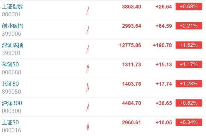 | 上证指数 | 3863.40 | +26.64 | +0.69% | | --- | --- | --- | --- | | 000001 | | | | | 创业板指 | 2993.64 | +64.59 | +2.21% | | 399006 | | | | | 深证成指 | 12775.86 | +190.78 | +1.52% | | 399001 | | | | | 科创50 | 1311.73 | +15.13 | +1.17% | | 000688 | | | | | 北证50 | 1403.78 | +17.74 | +1.28% | | 899050 | | | | | 沪深300 | 4484.70 | +36.65 | +0.82% | | 000300 | | | | | F班50 | 2960.61 | +10.05 | +0.34% | | 000016 | | | | 格隆汇11月25日|A股主要指数拉升,创业板指涨2.21%,沪指涨0.69%,深成指涨1.52%,算力硬件、 AI应用、贵金属、量子科技等方向领涨,沪深京三市上涨个股超4600只。 ...